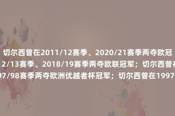 切尔西曾在2011/12赛季、2020/21赛季两夺欧冠冠军; 切尔西曾在2012/13赛季、2018/19赛季两夺欧联冠军; 切尔西曾在1970/71赛季、1997/98赛季两夺欧洲优越者杯冠军; 切尔西曾在1997/98赛季、2020/21赛季两夺欧洲超等杯冠军; 往届欧协联冠军 2021/22赛季:罗马1-0费耶诺德 2022/23赛季:西汉姆2-1佛罗伦萨 2023/24赛季