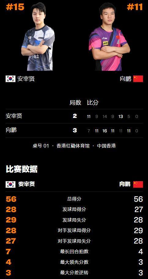 首局比赛一上来,两名选手就在接发球设施伸开抵挡,皆思要抢节律率先发动枢纽,从而掌执住主动权,在紧咬比分打到4平之后,向鹏通过天确凿措施,给我方创造出了侧身的契机,靠着强势的正手枢纽,向鹏连得3分建立起了7-4的最初,在时局一派大好之际,向鹏连合营假,让安宰贤打出一波7-0,以11-7逆转获得开门红。