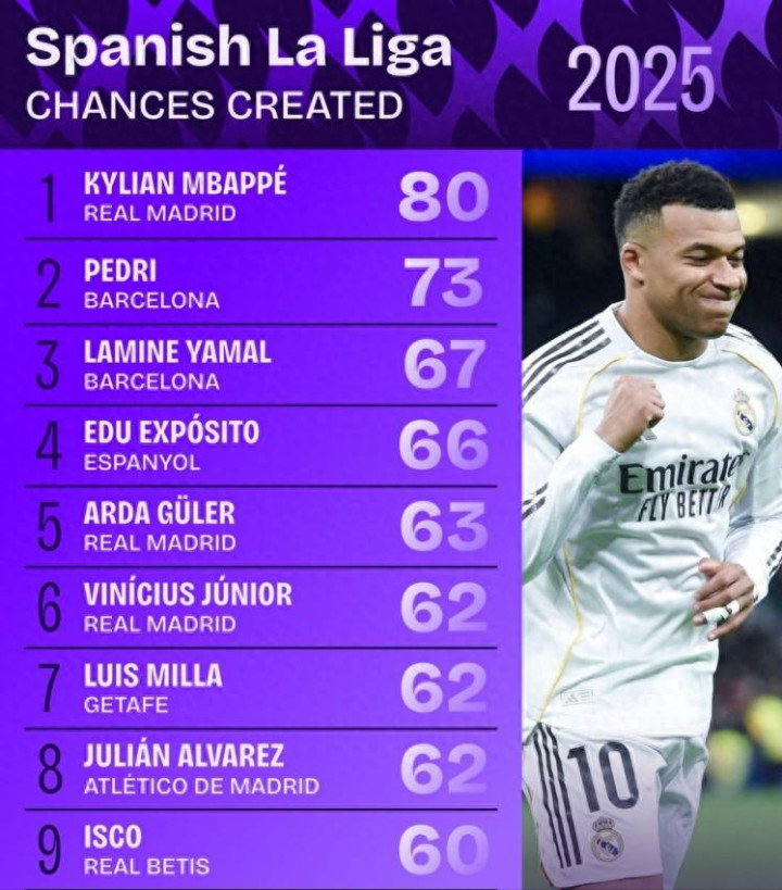 骂皇马姆巴佩只会吃饼的皆闭嘴!体育集锦 2025西甲创造契机榜炸了,谁能念念到压过佩德里登顶的竟是他? 谜底颠覆通盘理解! 对于皇马新王姆巴佩的争议,从来就没断过。 不少球迷皆合计,姆巴佩即是个站在禁区里等喂饼的纯弓手,进球全靠刷数据,以至会打乱皇马的战略节拍,根蒂不配当足坛即战力第一。 但这些质疑声,在一份最新的官方数据眼前,透顶站不住脚了。 姆巴佩能坐稳这个位置,靠的从来不是命运,而是实打实的全面实力,还有被好多东说念主严重低估的契机创造智商。 2025年眼看就要松手,泰斗足球媒体squa