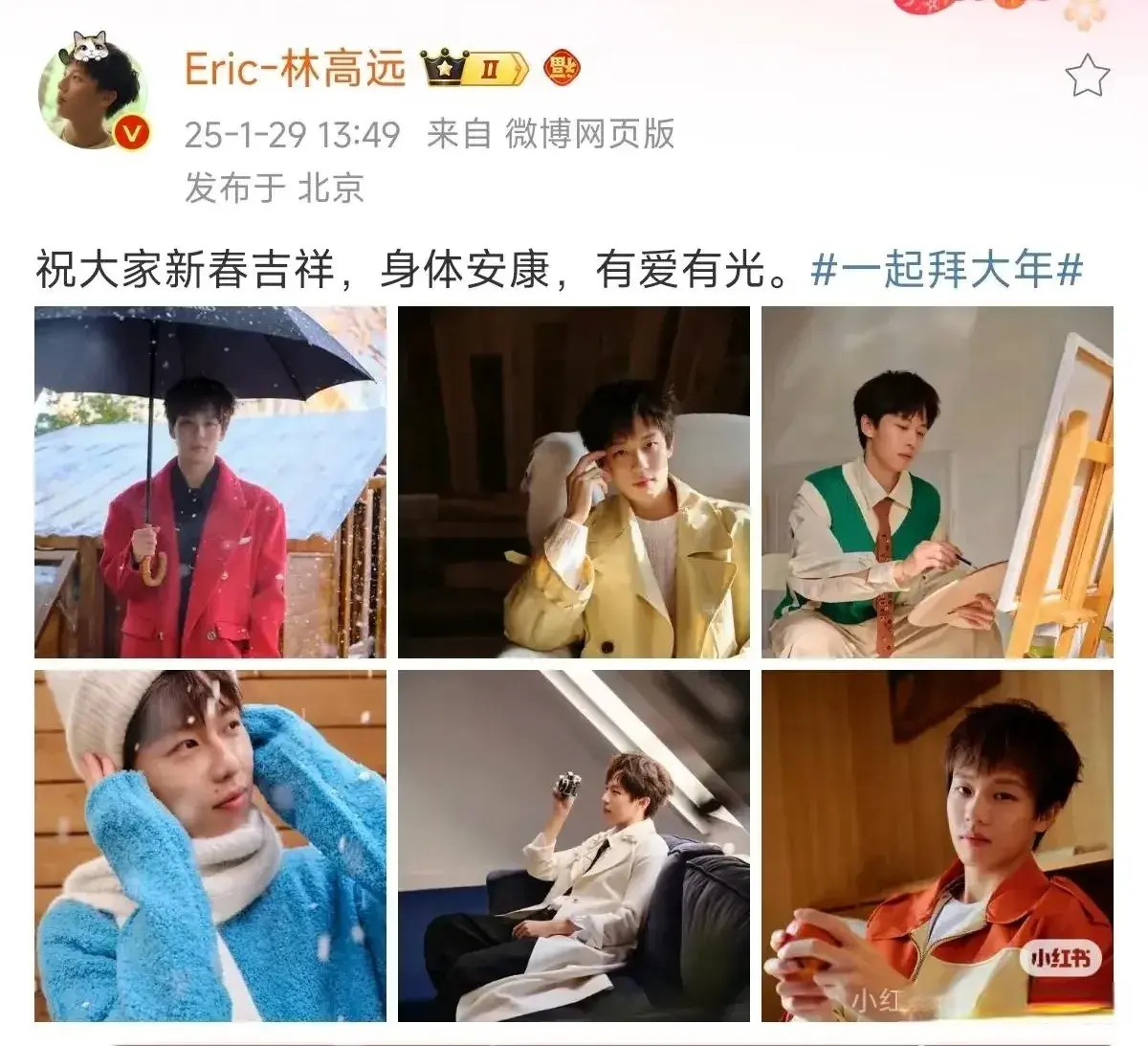 这两天看到内部也录了好几个视 频,为公共奉上新年道喜。今天看到林高远也更新了抖音:“祝公共新春祯祥,体魄安康,有爱有光。”配了6张他拍杂志的相片,果然是五彩的林高远,什么花式的穿着林高远齐能独霸得了。